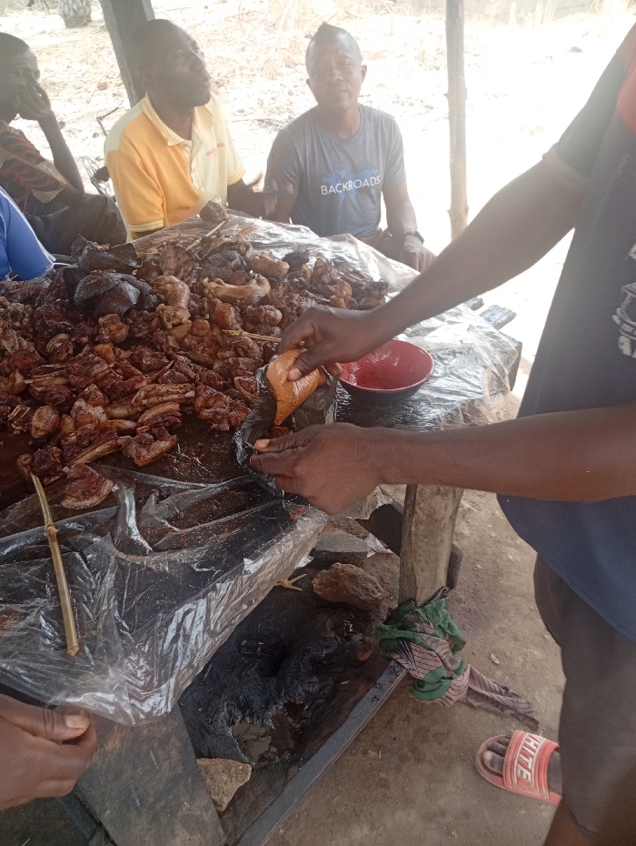 table covered with a plastic sheet, piled high with a large quantity of meat. The meat is arranged in a haphazard manner, with some pieces being larger than others. A red plastic bowl is on the table, and a person in a blue shirt with a "BACKROADS" logo is sitting in the background. A person in a yellow shirt is sitting in the background. A person dressed in a blue shirt is preparing to eat from the table. The scene is likely in a public marketplace, restaurant, or street food stand in Assai Sabongida, Nigeria, based on the provided coordinates. The image is likely taken from the perspective of a person standing near the table. The scene is focused on the table and the meat, but other people and objects are in the background. The lighting is bright. The image is well-composed and in focus. It captures the bustling energy and activity of a crowded marketplace. The image provides a glimpse into the daily life of people in this part of Nigeria. The foreground is dominated by the table covered in meat, while the background shows a group of people sitting or standing and interacting with the meat. The scene is likely set in an outdoor area as there is foliage in the background. The person taking the photo is likely an observer who is standing close to the table.