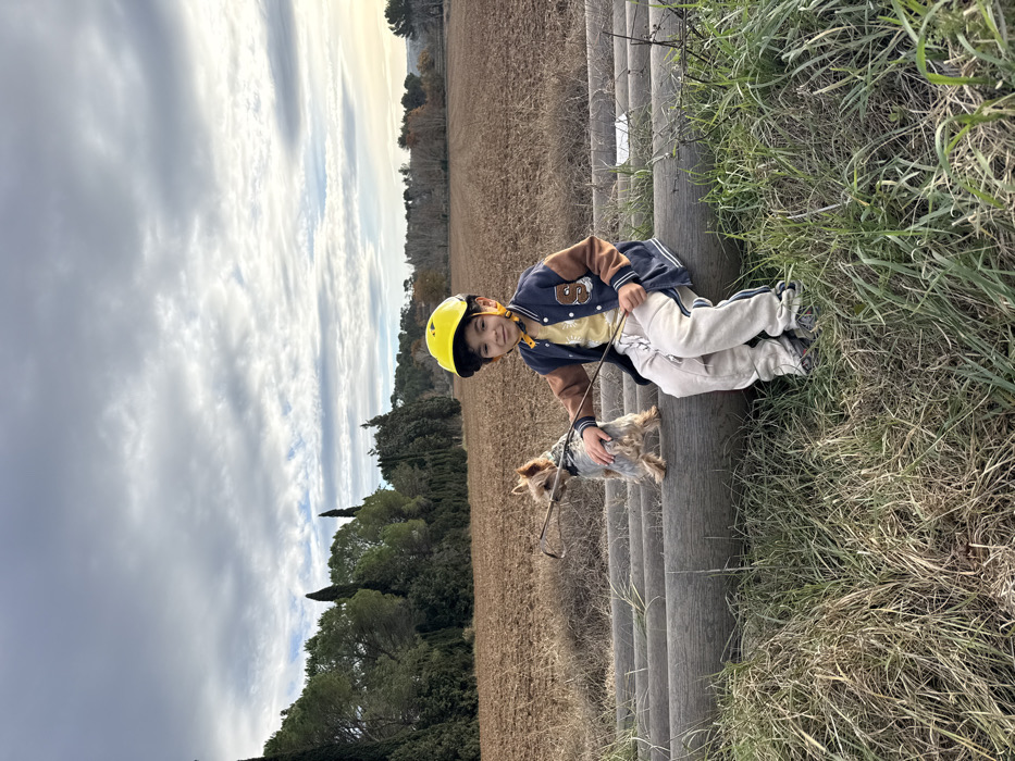 An outdoor scene in Rousset, France, depicts a young boy and a dog seated on a row of three parallel, weathered logs. The boy, approximately 5-7 years old, wears a yellow protective helmet, a dark blue and brown varsity-style jacket, a yellow shirt, light grey sweatpants, and dark athletic shoes. He is smiling directly at the camera, holding a slender stick with a curved hook-like end in both hands. To his left, a small, grey and tan Yorkshire Terrier-type dog, wearing a dark harness, stands on the logs, looking towards the stick. The logs rest on a base of long, dry, and green grasses. Behind the subjects, a large, recently tilled brown field extends into the midground. The background features a treeline composed of various evergreen and deciduous trees under an overcast sky with patches of brighter light.