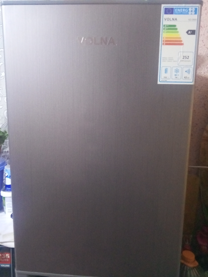 A silver-colored VOLNA refrigerator stands against a wall. A sticker indicating its energy efficiency, rated A+, is visible on the upper right corner of the appliance's front. The brand name VOLNA is subtly imprinted near the top. Its sleek surface reflects the ambient light. Parts of cleaning supplies and other household items are visible at the bottom of the image, near the bottom left corner.