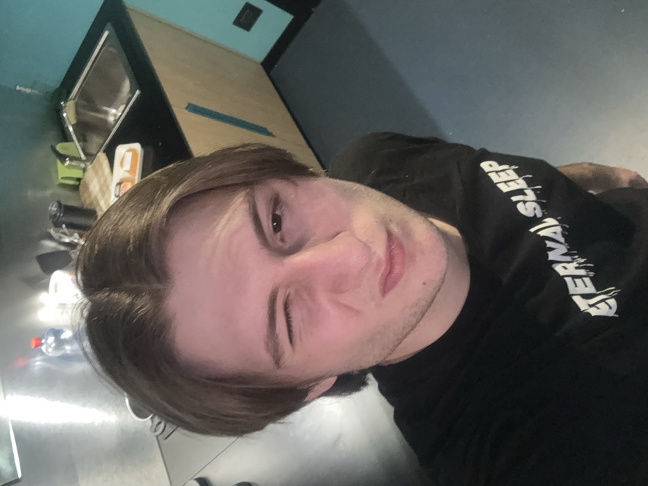 A forward-facing portrait captures a light-skinned male individual, approximately 20-30 years of age, with medium-length brown hair parted centrally. He is positioned with his right eye closed in a wink, his left eye open, and his mouth slightly puckered. He wears a black short-sleeved t-shirt featuring the white, stylized, dripping text "ETERNAL SLEEP" across the chest. The subject is photographed from a slightly elevated perspective, suggesting a selfie. The background reveals a compact kitchen or kitchenette area. To the upper left, a reflective dark surface, possibly a metal wall panel or countertop, displays a clear plastic bottle with a red cap and a roll of white paper towels. To the upper right, a black countertop contains a single rectangular stainless steel sink with a chrome faucet. On the countertop, left of the sink, a light-colored mat holds two small, orange-packaged items. A dark cylindrical container and a green object are also present on the counter. Below the countertop are light wood-paneled cabinets, with a vertical blue strip of tape or material affixed to the right cabinet door. The wall behind the cabinets is painted a light teal or turquoise color, featuring a dark rectangular fixture. The floor is a dark grey. The location is Novate Milanese, Italy.