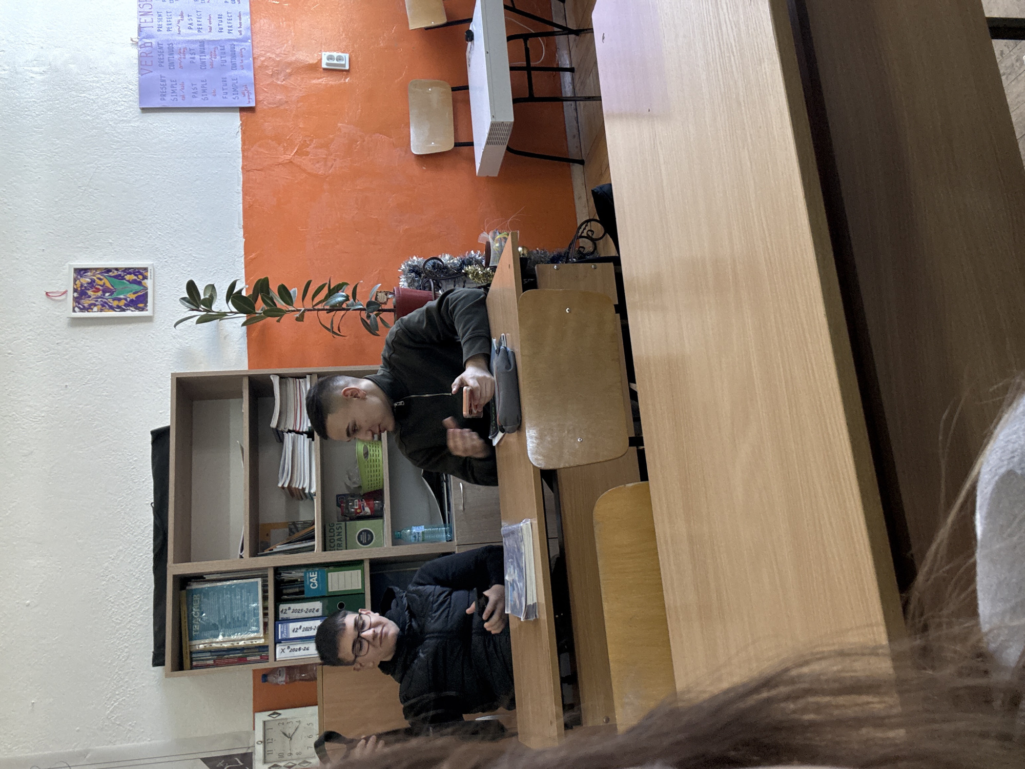 Two men are seated at desks in a classroom. The classroom has a wall with a split color scheme: white on the left and orange on the right. A grammar chart and a framed picture hang on the white part, and an electrical outlet is on the orange part. There is a bookcase filled with books and binders next to the wall. A small potted plant is also visible. The desks are made of light-colored wood and are arranged in a row. Additional desks and chairs are visible in the background, as well as an electrical panel. The location appears to be a classroom in Panagyurishte, Bulgaria.