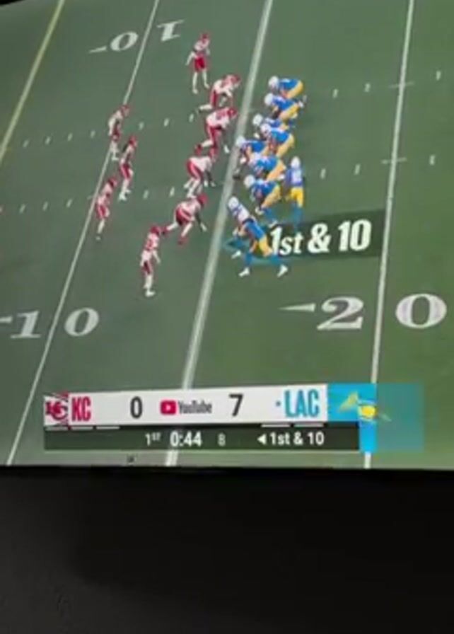 television screen displaying an American football game between the Kansas City Chiefs and the Los Angeles Chargers