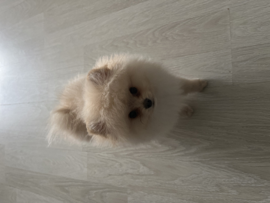 - "A light-colored Pomeranian dog stands facing directly towards the camera on a pale, wood-patterned laminate floor in an indoor setting within Varna, Bulgaria" by FM-nOJlk1, licensed under CC BY 4.0