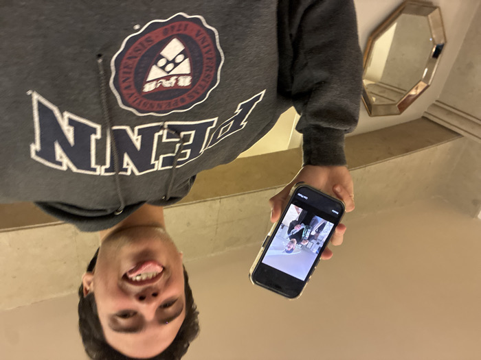 The image captures a male subject indoors in Huixquilucan de Degollado, Mexico. The subject, a light-skinned male with dark, curly hair, directly faces the camera with his tongue slightly extended, displaying a small silver tongue piercing. He is wearing a dark grey hooded sweatshirt featuring "PENN" in prominent blue and white collegiate lettering on the chest, beneath which is a circular emblem identified as the seal of the University of Pennsylvania, including the text "UNIVERSITAS PENNSYLVANIENSIS" and "1740." The subject holds a black smartphone, protected by a clear case, in his raised right hand, presenting its screen towards the viewer. The phone's screen displays a photograph of another male figure holding two green bottles in an indoor setting. The background consists of a plain, light beige ceiling and a distinct, horizontal architectural beam. On the wall below the beam, a hexagonal mirror with a metallic frame is mounted, reflecting a partial view of the interior. The scene is illuminated by ambient indoor lighting.