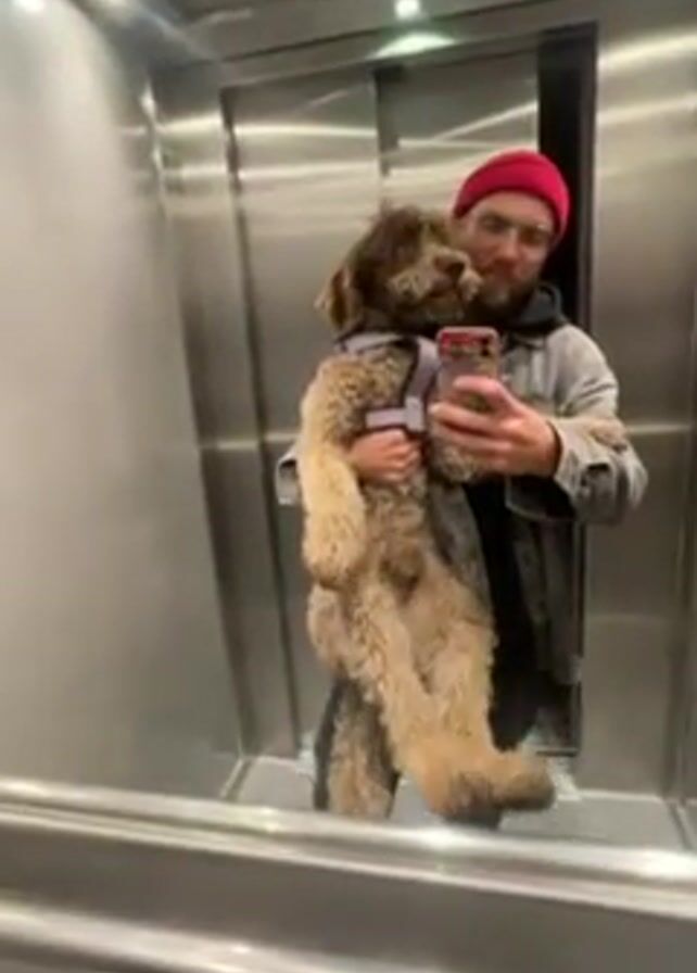 A man with a beard, glasses, and a red beanie is holding a medium-sized dog with a light brown, curly coat in an elevator