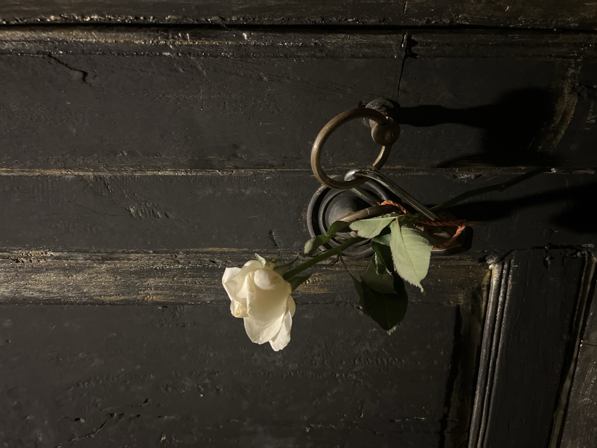 - "A single white rose is draped over a metal ring door knocker on a black, likely wooden, door" by FM-kCD023, licensed under CC BY 4.0