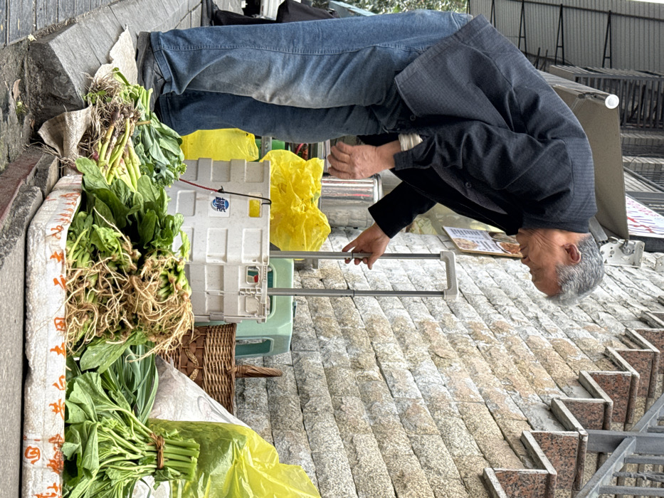 An older male, of apparent East Asian ethnicity, with short grey hair, is depicted bending forward on a street in Beibei, China. He wears a dark, patterned long-sleeved jacket, a light-colored undershirt, and faded blue jeans. His right hand grips the extended handle of a light-colored collapsible trolley or crate, marked with Chinese characters "超能". This crate, along with multiple crinkled bright yellow plastic bags, a brown woven basket, and a light green plastic stool, is positioned on a concrete sidewalk. In the foreground, bundles of fresh green vegetables, including leafy greens and root vegetables with exposed roots, are arranged on a white foam tray, extending slightly over a concrete curb. A second individual's lower legs and black shoes are partially visible in the far left background. The immediate background consists of a building wall constructed from light-colored, rectangular stone blocks. To the right, an outdoor staircase with reddish-brown granite treads and risers ascends along the wall, featuring a metal handrail. An awning or sign structure is visible overhead against the building facade.