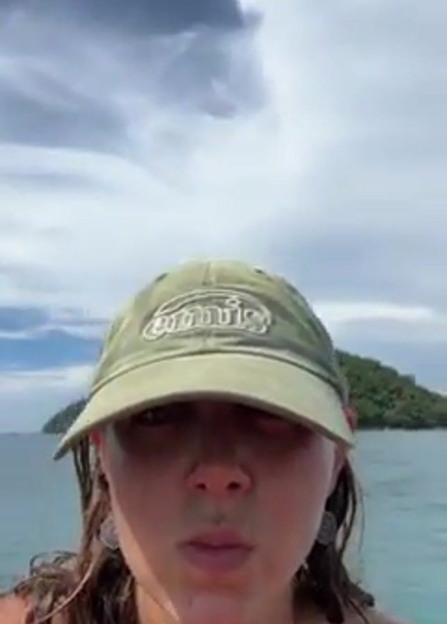 A woman wearing a green baseball cap is on a boat, recording a video of herself. In the background, a tropical island covered in lush vegetation can be seen. The water is a clear turquoise color. The sky above is partly cloudy.