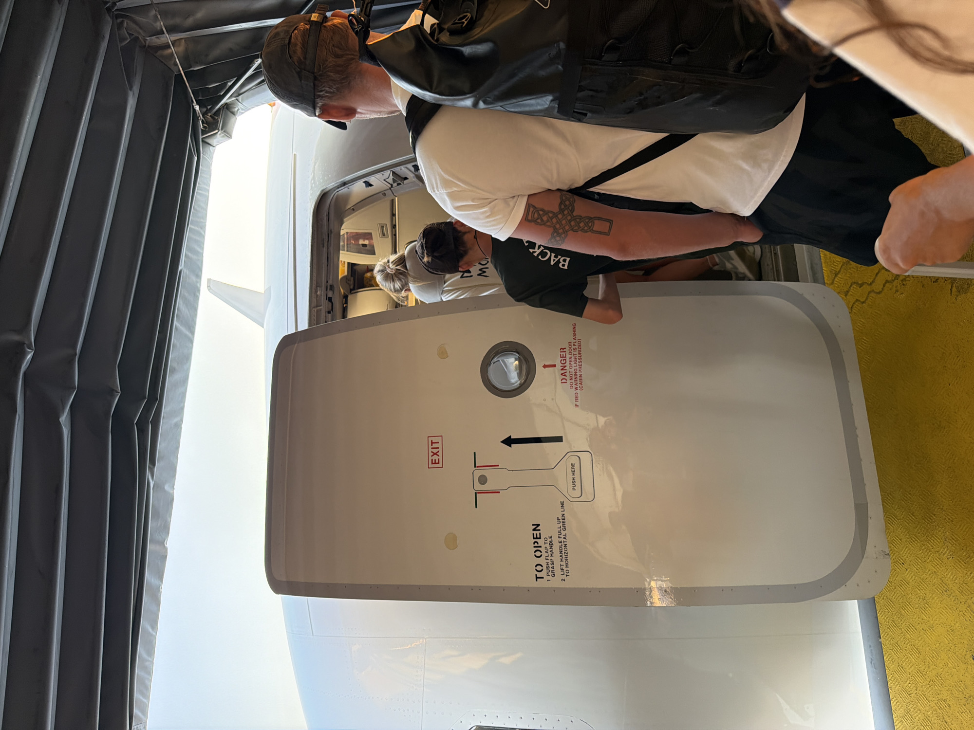 The image depicts passengers boarding a white aircraft through an open door, likely at an airport in Mai Khao, Thailand. The foreground shows the back of a male individual wearing a dark baseball cap, a white t-shirt, and black shorts. A prominent Celtic knot tattoo is visible on his right upper arm, and he carries a black dry-bag style backpack on his right shoulder. He is positioned behind another individual, also seen from behind, wearing a dark t-shirt with partially visible text "BACK TO MOON" on the back, who is actively stepping into the aircraft. A third person with blonde hair is dimly visible further inside the aircraft cabin. The open aircraft door, part of the white fuselage, displays "EXIT" in red text, alongside a diagram instructing "TO OPEN" by pushing a flap, grasping a handle, and lifting it to a horizontal green line. A small circular window is present on the door. A "DANGER" warning regarding cabin pressure is partially visible. The immediate ground leading to the aircraft is covered by a yellow, textured floor. Overhead, a dark gray, pleated fabric structure forms a canopy or walkway covering. The background reveals a bright sky and a white fin-like structure, likely part of the aircraft's tail or wing, suggesting an outdoor boarding process under clear conditions. A hand is visible in the lower right foreground, partially obscuring the view of the floor.