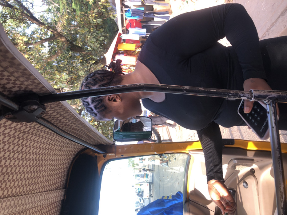 The image depicts a daytime scene from within a yellow auto-rickshaw in Bukuru, Nigeria, looking outward onto a street and market area. A female individual, seen from the right side, occupies the foreground. She has dark braided hair styled with geometric patterns and reddish-brown extensions pulled back. She wears a long-sleeved black top and two small gold earrings on her visible ear. Her left hand holds a white smartphone displaying a numeric keypad. Her right hand rests on the vehicle's interior panel. The vehicle's side mirror reflects the upper body of a male individual wearing a white shirt. To the left, a street is visible with light vehicle traffic, including white vans, and pedestrians. To the right, an outdoor market features various colored garments (red, yellow, blue, white) displayed on racks beneath a red-orange canopy. A large tree with green foliage is present above the market stalls.