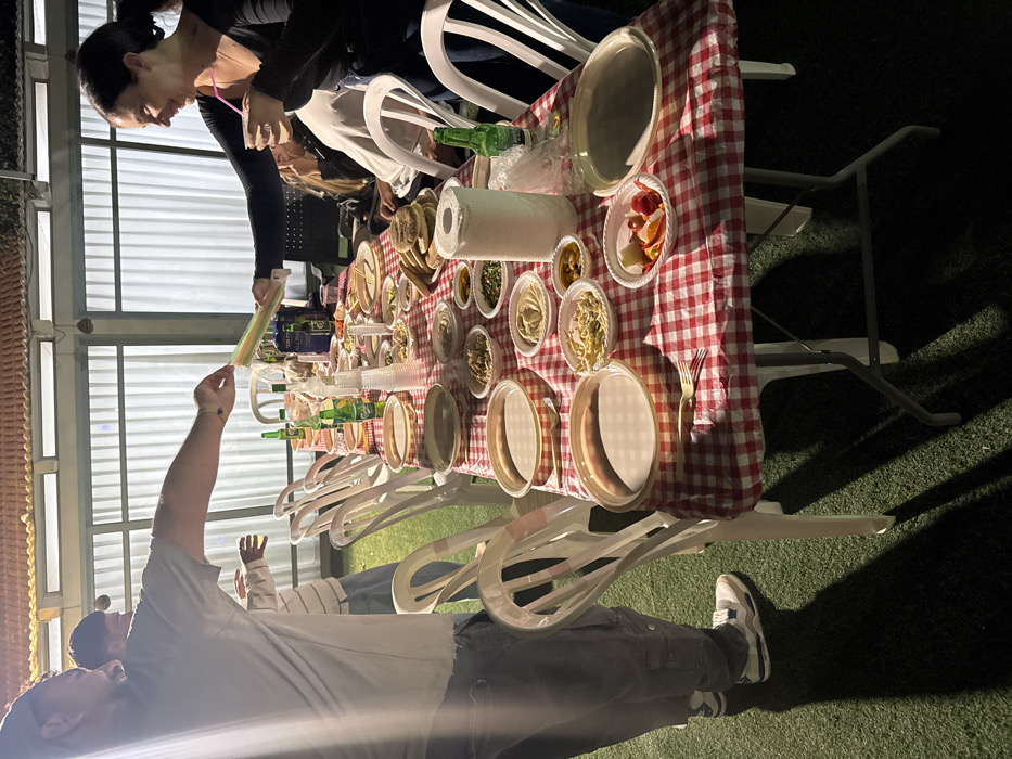 This image depicts an outdoor evening gathering at a residence or event space in Kfar Yona, Israel
