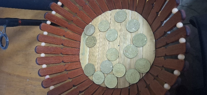 The scene is set indoors, within the city of Iquique, Chile. The primary subject is an open, expandable wooden basket or bowl, viewed from above, resting on a light-brown wooden surface. The basket features dark reddish-brown wooden slats arranged radially, connected by small, light-colored spherical beads, forming its sides. The circular base of the basket is made of lighter-toned wood with visible horizontal grain. Inside the basket, approximately 17-18 metallic coins are loosely scattered across the wooden base. Several coins are identifiable as Chilean 10 Peso coins, showing "10 PESOS" text and a national emblem on their obverse. The coins exhibit a dull, greenish-gold patina. In the upper right background, partially visible, is the dark, slender shaft of an object consistent with a fishing rod, featuring a silver-colored eyelet. No individuals are present. No explicit actions or interactions are depicted.