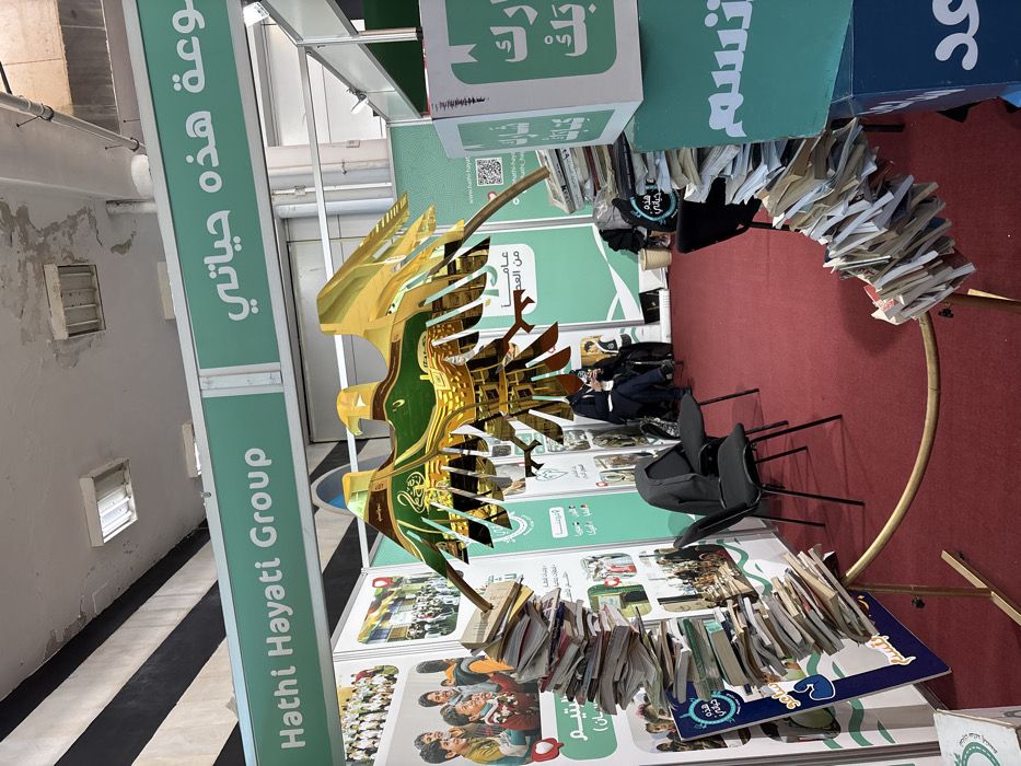 The scene depicts an indoor exhibition booth located in Al-Ghizlaniya, Syria. The floor is covered with a red carpet. Overhead, an industrial-style ceiling with black and white striped beams, visible conduits, and fluorescent light fixtures shows signs of wear and minor water damage. The booth, prominently labeled "Hathi Hayati Group" and "مجموعة هذه حياتي" in Arabic on a large green header, is enclosed by light green panels. These panels feature photographic collages of children and adults, Arabic text, and a QR code linked to "hathi-hayati.com". A large, stylized golden eagle sculpture, appearing reflective and multi-layered with green accents and Arabic calligraphy, is centrally positioned. Two black chairs are visible in the mid-ground, with one tipped forward. Two adults are seated behind the eagle sculpture; one is occupied with a mobile phone. Book displays form significant elements of the booth: a tall, vertical stack of diverse books stands on the left, while a curvilinear arrangement of books forms an arc on the right, supported by a golden railing and culminating near two stacked boxes. The upper green box displays the Arabic text "شارك كتابك" (Share your book), and the lower blue box shows "و ابتسم" (and smile). A visible book cover in the left stack also bears the title "هذه حياتي" (Hathi Hayati).