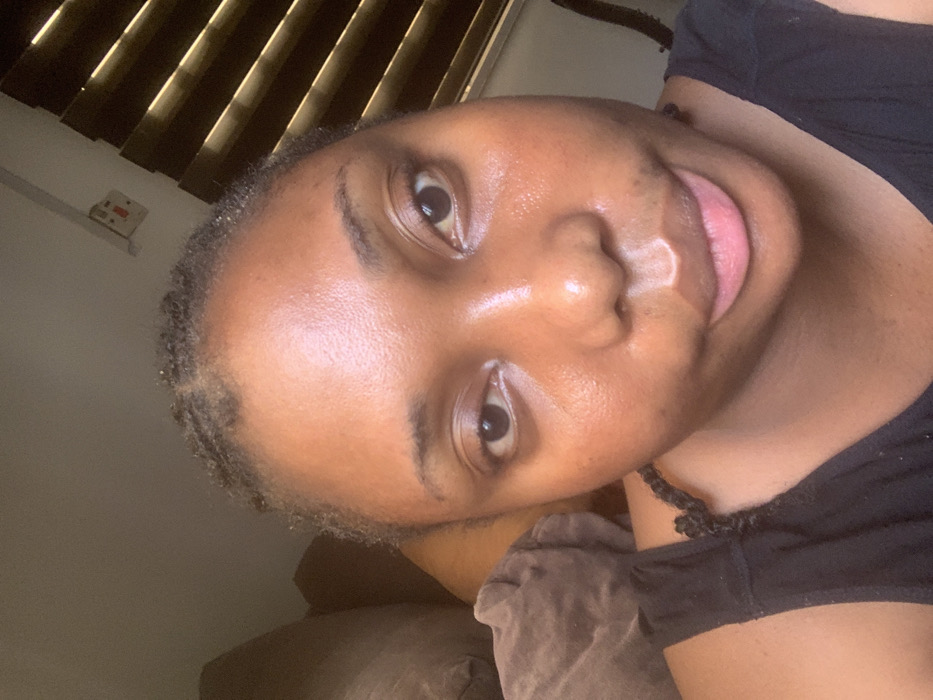 A close-up selfie features an adult female with dark skin, facing the camera directly