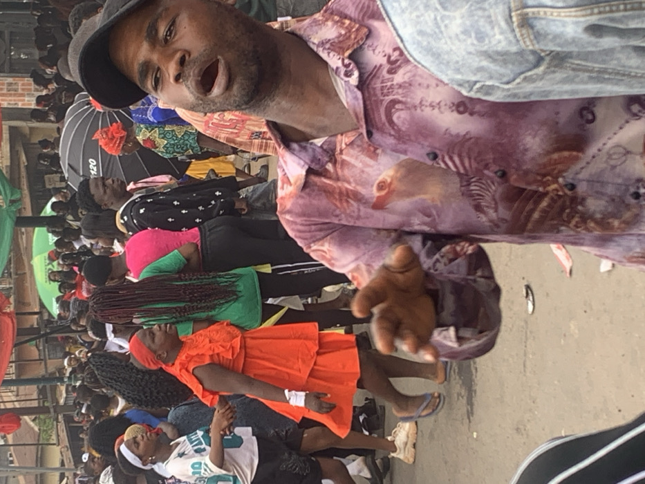 The image depicts a crowded outdoor scene on a paved street in Otuocha, Nigeria. In the immediate foreground, a dark-skinned male, wearing a black baseball cap and a light purple long-sleeved button-up shirt with a detailed bird/dinosaur skull and skeletal print, faces forward with his mouth open and right hand extended. A denim jacket is draped over his left shoulder. In the midground, to the left of the foreground subject, a dark-skinned female in a bright orange tiered, sleeveless dress and a matching orange headwrap walks towards the right, looking left. White material is wrapped around her left wrist, and she wears blue flip-flops. Adjacent to her left, another dark-skinned female in a white t-shirt with a blue graphic, black shorts, and white sneakers, with a white headband, appears to walk alongside her, possibly holding hands. Further back, a dark-skinned female with long braids wears a green t-shirt and black pants with side stripes. The background is densely populated with numerous individuals, primarily dark-skinned, engaged in various activities within the street. Overhead, red and green fabric or tarps are strung across the scene. A large black umbrella or lighting reflector is visible amidst the crowd on the right side of the midground. Building structures are partially discernible in the far background. The street surface exhibits minor debris.