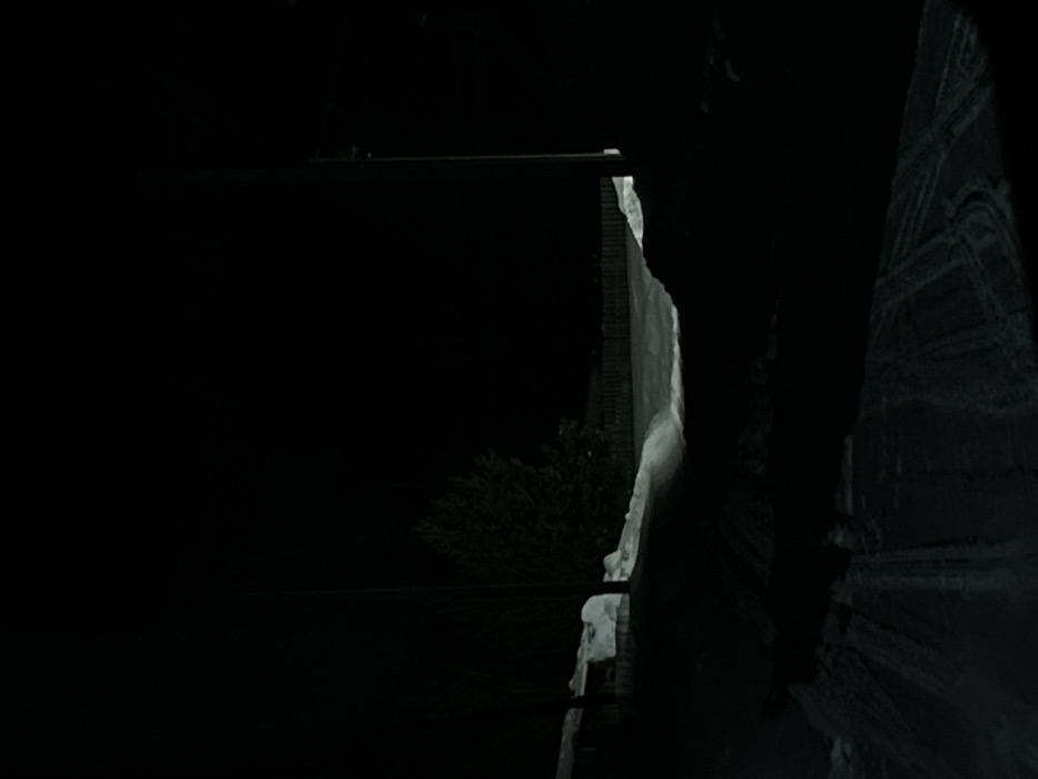 The low-lit image presents a stark contrast of light and shadow. On the right, a textured wall, possibly brick, is heavily shadowed. To its left, a vertical, illuminated crevice reveals a glimpse of a distant tree, adding depth. A dark, empty space dominates the left. A horizontal line, possibly a wire, cuts through the darkness.