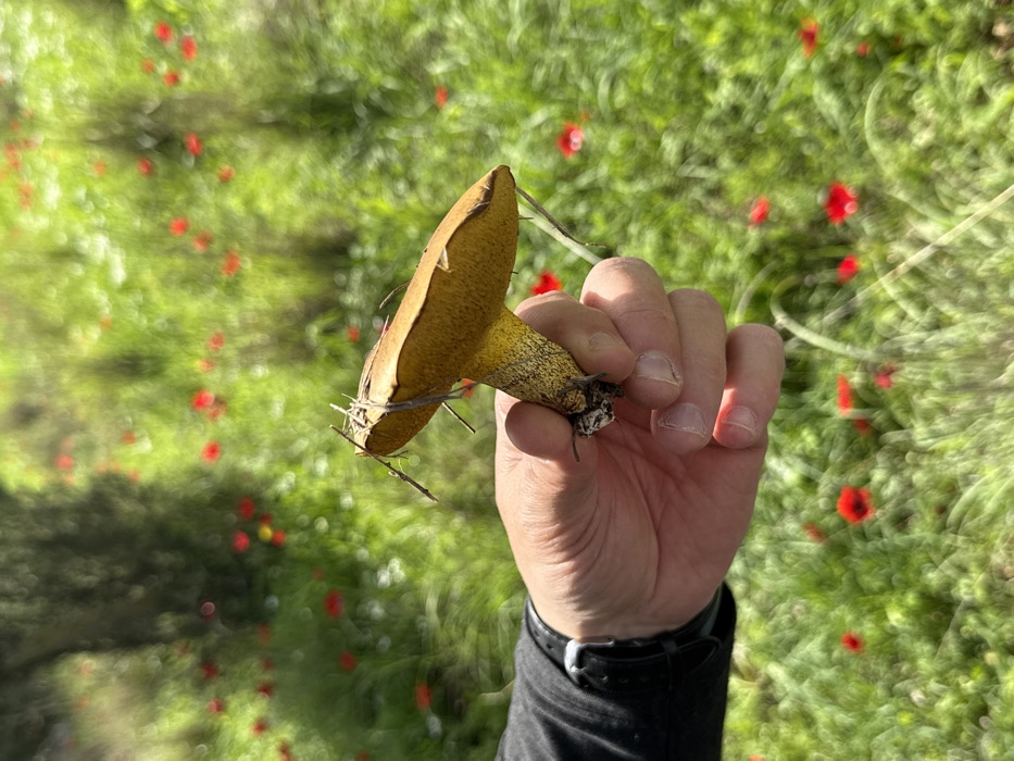 A light-skinned left hand, wearing a dark long-sleeved garment and a dark smartwatch on the wrist, holds a mushroom in the foreground. The hand grips the mushroom's thick, speckled yellow stem, which exhibits white fibrous material at its base. The mushroom's cap is broad and tan-brown on its upper surface, bearing small twigs and debris, while its visible underside is bright yellow and appears porous. The background is an out-of-focus green field densely populated with numerous small, bright red flowers, consistent with poppies. A dark, blurry mass, likely a tree or dense foliage, is present in the upper left background. The scene is brightly illuminated by natural sunlight. The precise location within Modiin-Maccabim-Reut, Israel, cannot be determined from the visual information provided, but the natural environment is consistent with open spaces in the region during springtime.