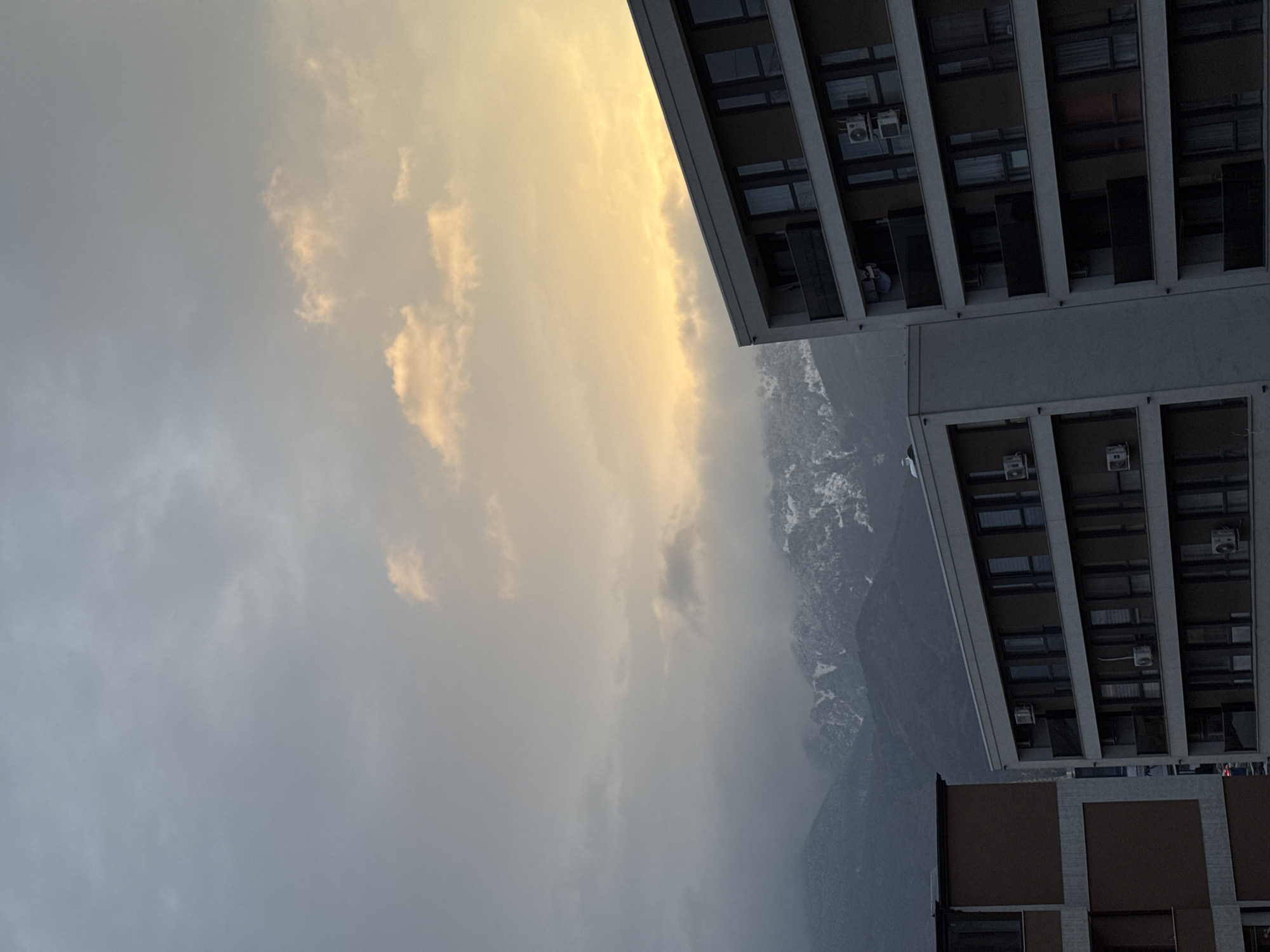 The image depicts an urban residential area in Sofia, Bulgaria, with Vitosha Mountain visible in the background. The scene is illuminated by either sunrise or sunset, casting a golden-yellow hue on the clouds and sky in the upper right portion, transitioning to a cooler grey-blue on the left. The mid-ground features the peaks of Vitosha Mountain, partially shrouded in clouds and haze, with significant snow cover on its upper slopes, indicating a cold season. In the foreground, three multi-story residential buildings are visible. The dominant structure on the right is a modern apartment building with a white facade and dark brown paneling around windows and balconies. Multiple large windows are present, and several white wall-mounted air conditioning units are visible beneath windows on various floors. Dark railings define individual balconies, one of which has laundry hanging. A second, similar building is partially obscured behind and below the right-hand structure, also exhibiting white framing and dark panels with air conditioning units. A third, darker building, featuring prominent horizontal and vertical light-colored bands against a dark brown facade, is partially visible on the far left. No individuals or specific actions are directly observable, though the presence of laundry indicates human habitation.