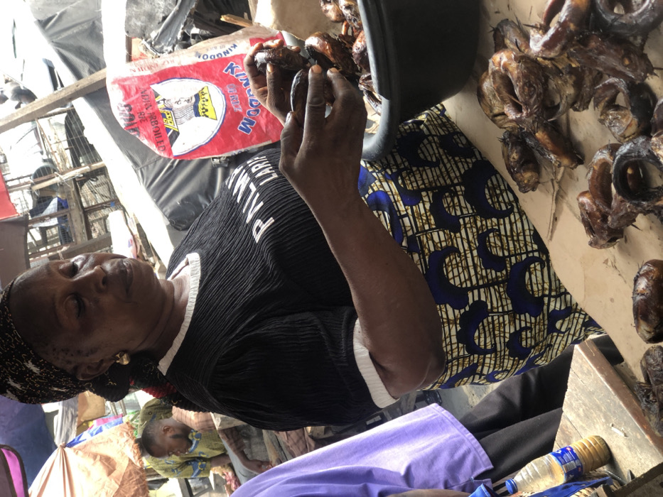 A middle-aged woman is depicted in an outdoor market setting in Aiyetoto-Asogun, Nigeria