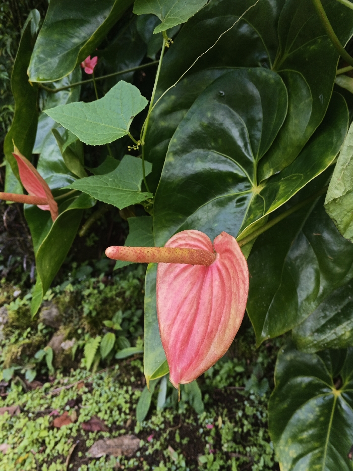 A close-up captures a pink anthurium flower with a textured spadix, surrounded by lush green foliage. Shiny, heart-shaped leaves dominate the background, interspersed with lighter green, vine-like plants. The ground is covered in small plants and moss, suggesting a humid, thriving environment. A single pink flower is also spotted in the background.