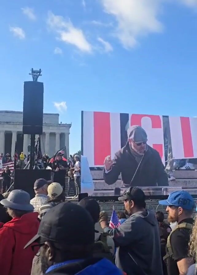 The video depicts a crowd of people gathered in front of a stage, with a large screen displaying a man speaking. The crowd is diverse, with people of various ages and ethnicities visible. Some are holding signs with messages related to impeachment and peace, while others wave American flags. The background includes a large building, possibly a monument, and trees with bare branches. The sky is blue with scattered clouds, suggesting a clear day. The atmosphere appears to be politically charged, with a sense of protest and activism.