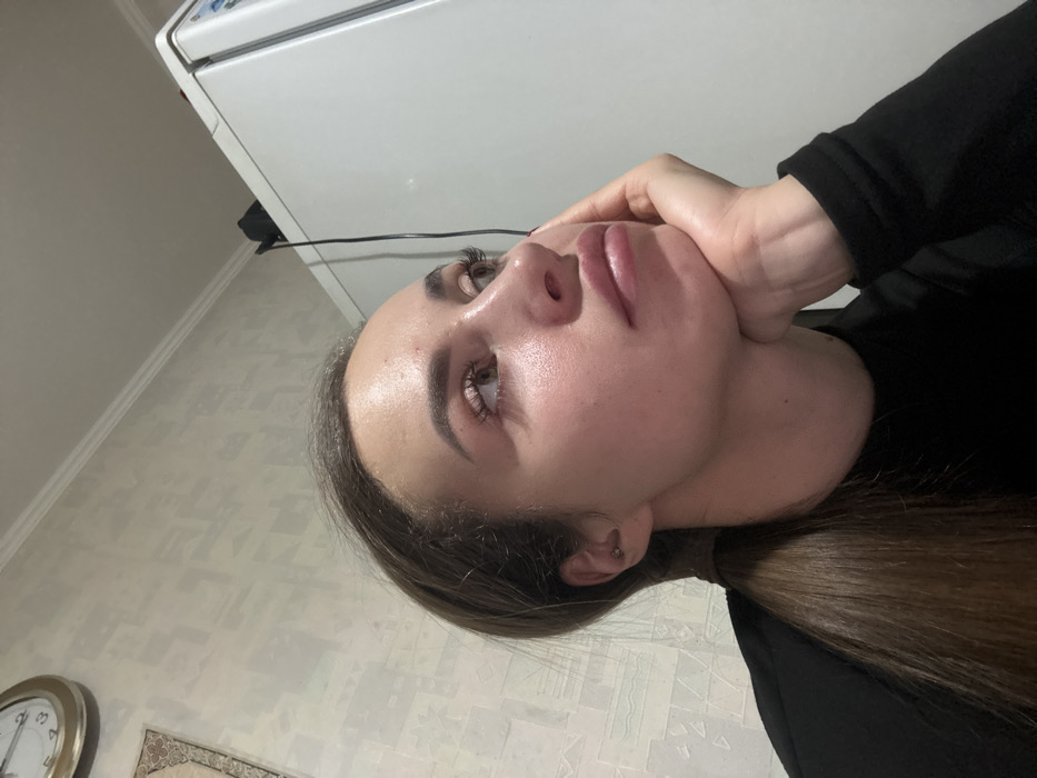A woman in a black top rests her face in her hand, gazing upwards. Her skin is fair and dewy. She has brown hair and eyelashes. The background is a beige patterned wall, a clock, and a white appliance, possibly a refrigerator. A black cable snakes up from behind her head towards the appliance.