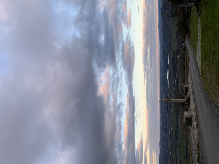 The image presents an elevated panoramic view from Macedo de Cavaleiros, Portugal. In the foreground, a gray stone cross stands vertically on a semi-circular cobblestone platform. Two large, rectangular, roughly hewn stone blocks flank the base of the cross. An asphalt road curves from the left foreground, passing in front of the monument, and descends towards the right into the landscape. To the immediate right of the road, a section of green grass is visible. The midground and background depict extensive rolling hills and valleys, characterized by various shades of green and brown vegetation, with small clusters of structures and faint distant settlements. A horizontal body of water, resembling a lake or reservoir, stretches across the mid-distance. The sky, occupying the upper two-thirds of the frame, is overcast with multiple layers of clouds, displaying tones of dark gray, bluish-gray, and streaks of soft pink and orange, suggesting either dawn or dusk. No individuals or active subjects are present.
