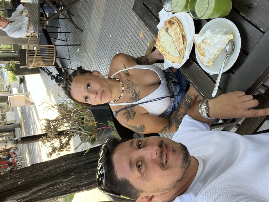 The image displays an outdoor cafe scene in City Bell, Argentina, during daylight. In the foreground, a man with short dark hair, a mustache, and a beard, wearing a white t-shirt and a silver watch, looks towards the camera with a slight smile. Sunglasses are perched on his head. Seated next to him is a woman with braided hair, numerous tattoos visible on her arms and chest, a white V-neck top, and denim shorts. She wears a shell necklace and multiple earrings and looks directly at the camera with a neutral expression. They are seated at a dark wooden slatted table. On the table, in front of the woman, is a white plate holding two folded food items, possibly quesadillas, with visible ham and cheese filling. In front of the man, a white plate contains a slice of meringue pie with a silver spoon. Two glasses of a green beverage are also present. In the background, an older man with white hair, wearing a white shirt, is seated alone at another outdoor table. The environment includes a checkered tiled sidewalk, potted plants (some appearing dry), a tree trunk, commercial buildings, and a parked scooter.