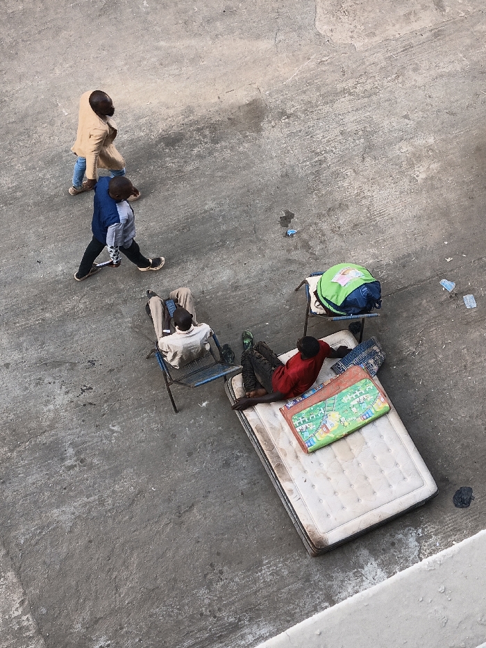 - "An aerial view shows two people sitting on chairs, another on a mattress, and two people walking" by FM-Bh3W72, licensed under CC BY 4.0