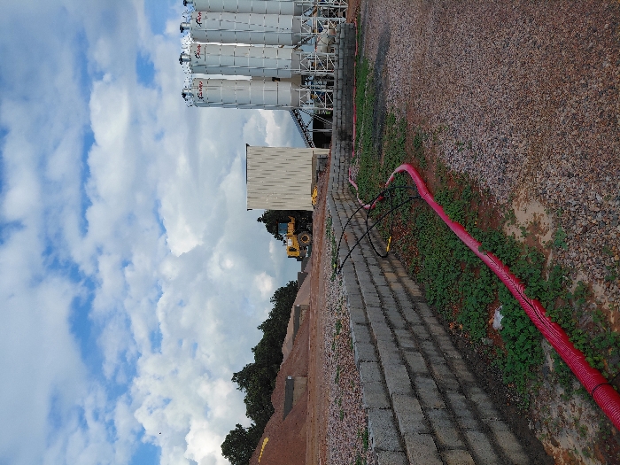 This image depicts an industrial site, likely a concrete or aggregate plant, located in Bni Yakhlef, Morocco. The scene is presented under a partly cloudy sky with prominent white cumulus clouds. In the foreground, a low, grey concrete block retaining wall runs horizontally along the left side. Adjacent to the wall, a long, red corrugated pipe is laid across a strip of ground populated by small green plants and interspersed with reddish gravel. Several black, arched pipes or conduits cross over the red pipe. The midground features large, irregular mounds of reddish-brown earth or aggregate material. Behind these mounds, a line of dark green trees or dense bushes is visible. Partially obscured by the trees and mounds, a yellow wheel loader or similar heavy construction vehicle is present. To the right of the loader, a tall, rectangular structure with light-colored vertical corrugated siding stands. The background on the right side of the image is dominated by a cluster of four tall, cylindrical, light grey industrial silos. Each silo displays a logo, identifiable as "RMB," near its upper section. These silos are supported by metal scaffolding and appear to be integrated with conveyor belt systems and other industrial machinery, consistent with a batching plant. No individuals or active operations are observable within the depicted scene.