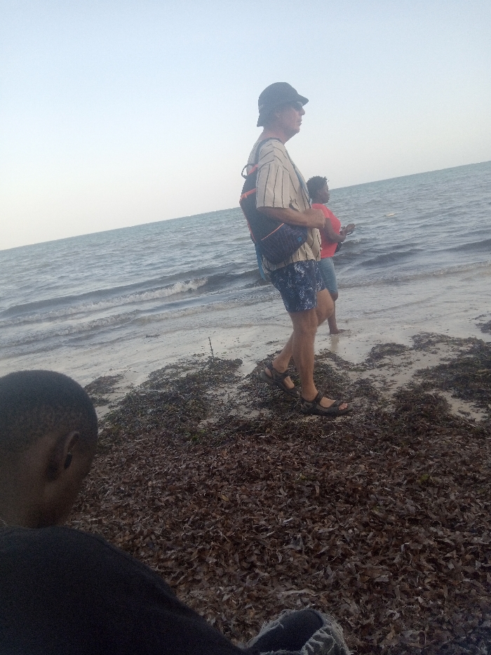 The image depicts a coastal scene within Shanzu ward, Kenya, presenting a view from a low vantage point across a beach towards the ocean under a pale sky. In the immediate foreground, on the bottom left, the dark-skinned head and upper left shoulder of an individual, possibly a child, are visible from behind, suggesting they are seated or crouching on the sand, looking towards the right side of the frame. This individual wears a dark garment. The midground features a sandy beach extensively covered with a dense layer of dark, dried seaweed or marine vegetation. Walking from left to right across the wet sand, near the water's edge, is a light-skinned adult. This individual wears a dark baseball cap, sunglasses, a light-colored vertical-striped short-sleeved shirt, patterned blue shorts, and dark sandals. A black and orange sling bag is worn over their left shoulder. Behind and slightly to the right of this person, a dark-skinned adult, wearing a red short-sleeved top and light-colored shorts, stands or walks with their feet in the shallow ocean water, holding a thin, light-colored object in their right hand. The background consists of the dark blue-grey ocean with small waves breaking near the shore, extending to a clear horizon line. The sky above is a uniform, pale blue or light grey, indicating diffuse daylight. The individuals in the midground appear to be moving along the coastline.