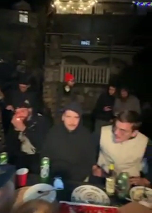 Several people are gathered outdoors at night around a table covered with plates, cups, and beverage cans. Some people are sitting at the table, while others are standing or walking around. One person is holding a cell phone and appears to be filming. The background includes a house with lights strung along the roofline. The overall atmosphere appears casual and social.
