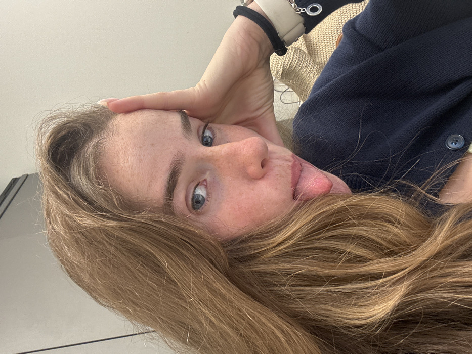 A close-up indoor portrait features a female subject with long, light brown hair, visible freckles on her nose and cheeks, and blue eyes. She is looking directly at the camera with her tongue slightly extended. Her left hand (viewer's right) rests on her forehead near the temple, revealing a black elastic band and a lighter-colored bracelet with a silver-toned circular charm on her wrist. She is wearing a dark blue knit cardigan with a visible button on the front. The background consists of a plain, light-colored wall, with a dark horizontal line visible in the upper left and a textured, woven, light brown object in the lower right. The image contains no visual elements to determine a specific location within the city of Bnei Brak, Israel.