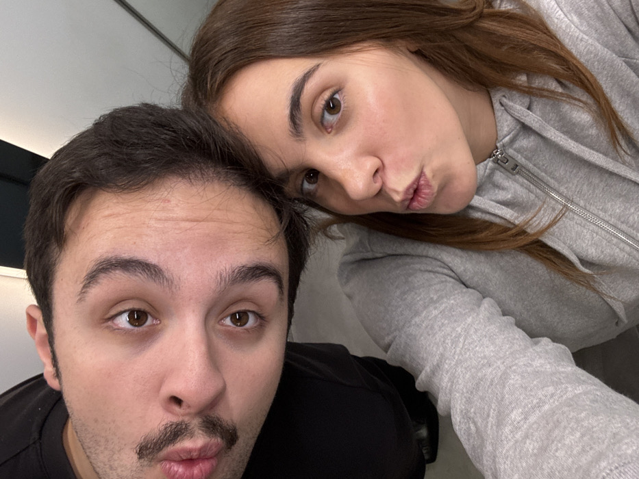 A close-up, tilted portrait displays two individuals, a male and a female, positioned with their heads close together. The male, on the upper left, has dark hair, brown eyes, and light facial hair, including a mustache. He wears a dark, unidentifiable garment. The female, on the lower right, has long brown hair and brown eyes, wearing a grey zippered hooded sweatshirt. Both individuals are looking towards the camera with their lips pursed in a "kissing face" expression. The background is indistinct, appearing as a plain, light-colored indoor environment without any identifiable objects or architectural features. The specific location within the city of Paris, France, cannot be determined from the provided image.