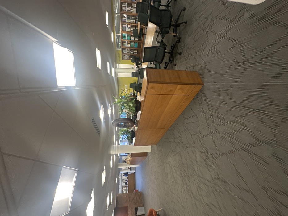 The image displays the interior of a library located in Wellesley, United States. The space features a dark gray patterned carpet and a white suspended ceiling with numerous square fluorescent light panels providing illumination. In the left foreground, a section of an orange upholstered armchair is visible. To its right, a dark waste receptacle stands adjacent to a partial red brick wall element. Dominating the midground is a long, light-brown wooden cabinet, functioning as a partition. Placed atop this cabinet are two black planters containing green plants, separated by a dark, abstract, ring-shaped sculpture. To the right of the wooden cabinet, a large, rectangular light-colored wooden table is surrounded by approximately six black office chairs with mesh backs and wheels. Further right, a partially obscured individual is seated at another table in the background. In the left background, a service counter or reception desk is visible, behind which two to three individuals are present. A prominent yellow wall section in the center background displays the text "Ask a Librarian!" in dark letters. To the right, multiple tall wooden bookshelves, filled with books, line the wall, with a sign reading "Library Staff" mounted above them. Additional tables and chairs are scattered throughout the background area.