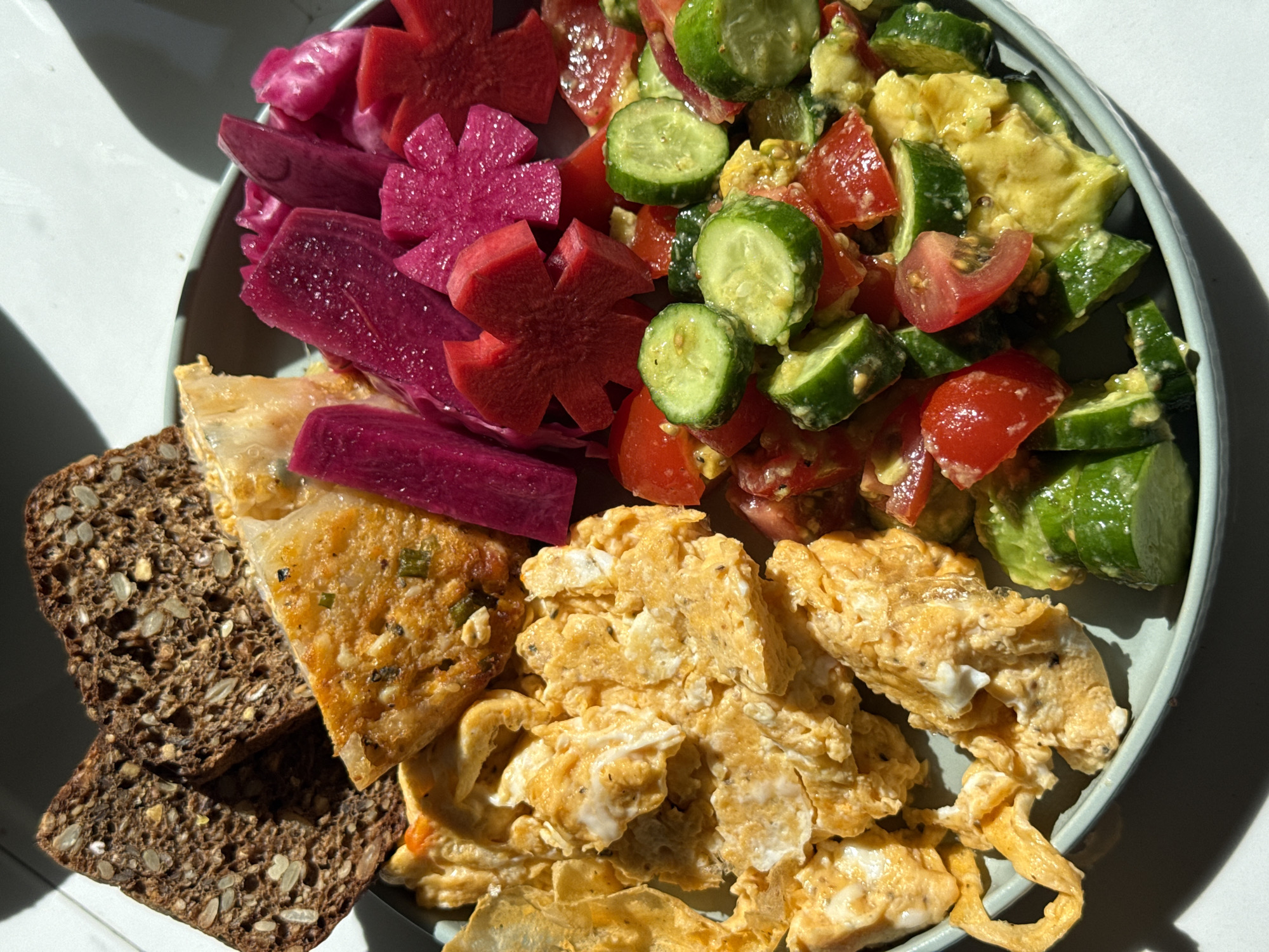 plate of food, likely taken during daylight hours given the strong shadows and bright lighting. The plate contains various items including dark, seeded bread, what appears to be an omelet, scrambled eggs, a vegetable salad with cucumbers and tomatoes, and some pickled radishes in flower and rectangular shapes. The plate is on a surface that appears white, and the overall scene suggests it is indoors, possibly a restaurant or home. There is no immediate indication of North Kuta, Indonesia in the image, and there are no people visible.