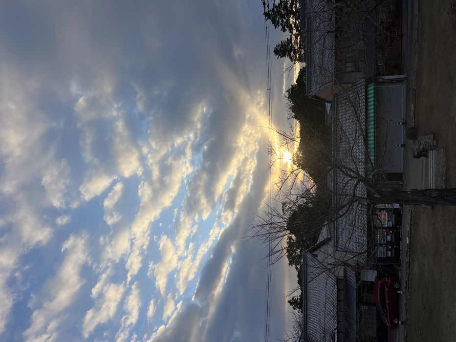 The image captures a sunset with striking light rays piercing through a sky filled with layered, textured clouds. The horizon features rooftops and trees, silhouetted against the bright sunlight. A bare tree is prominent in the foreground. A car sits parked outside.