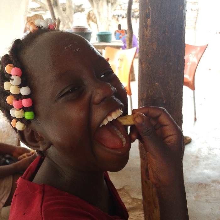 A dark-skinned child with colorful beads in braided hair joyfully eats