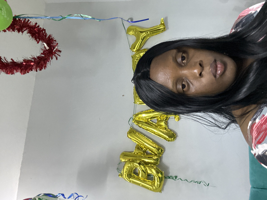 An adult female is depicted in a frontal, chest-up portrait within an indoor setting in Sabon Tasha, Nigeria. She has dark skin, a neutral facial expression with a slightly parted mouth, and straight, dark hair parted centrally, falling past her shoulders. She wears an off-the-shoulder garment patterned in red, white, grey, and black. The background consists of a light-colored wall. Golden foil balloons spelling "HAPPY" are strung across the wall behind her head. Red tinsel garland is suspended from the upper right corner of the frame, and blue and green curling ribbons hang from the ceiling in various places. A section of teal-colored upholstered furniture is visible to the left of the subject. The scene is illuminated by ambient light.