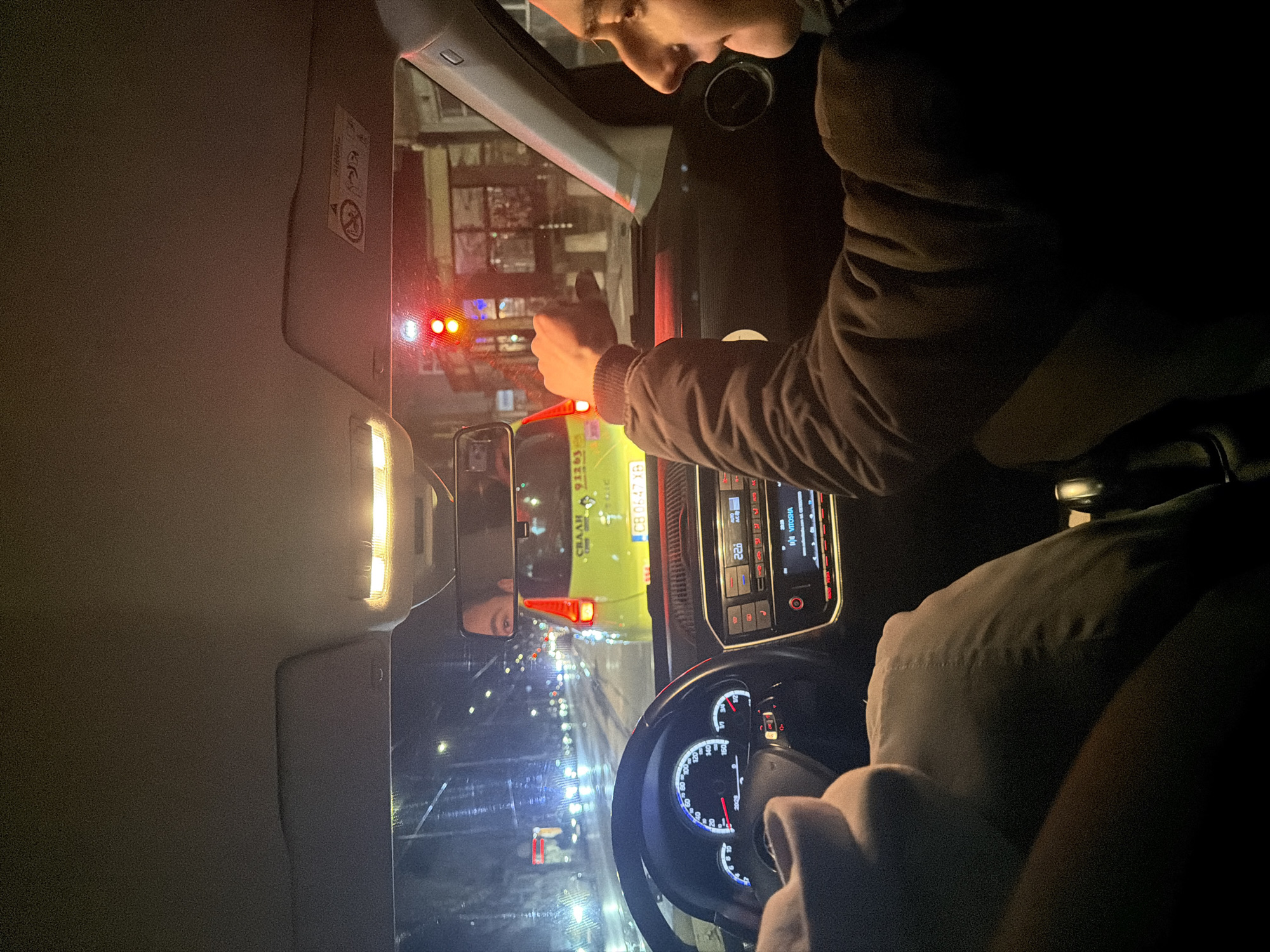 The image depicts the interior of a car, taken from the passenger seat perspective, at night in Sofia, Bulgaria. A man in a brown jacket is in the driver's seat, giving a thumbs-up gesture towards a vehicle behind. This vehicle, visible in the rearview mirror, is a yellow emergency vehicle with the license plate "CB 0647 BT." The car's dashboard and steering wheel are in view, and the interior light is on. The exterior scene shows a snowy street with other vehicles and buildings with lit windows. Traffic lights are visible in the distance.