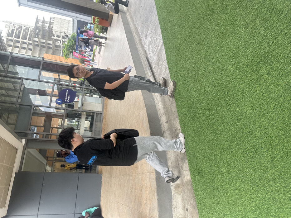 In Alaguntan, Nigeria, the image depicts an outdoor urban scene featuring two individuals in the foreground on a paved walkway, adjacent to a strip of artificial green turf. The individual on the left, an East Asian male, wears a black polo shirt with a white "VOLITEK" logo visible on the back, light grey sweatpants, and white sneakers. He is walking towards the right side of the frame, with his left foot elevated mid-stride, and appears to be adjusting a black bag held in his left hand. To his right, a second East Asian male, wearing a black t-shirt, grey pants, and light-colored athletic shoes with thick soles, carries a black backpack over his right shoulder. He holds a smartphone in his right hand and is looking directly towards the viewer. Behind the two foreground individuals is a modern multi-story building featuring a glass facade and dark grey panels. An "Information Centre" sign, a blue speech bubble with a white 'i' icon, is affixed to the glass. The ground transitions from tan-colored tiles to grey concrete. In the mid-ground and background, other individuals are visible: a person in a blue shirt and hat stands near the building entrance to the far left, another is seated further left. To the far right, a person in a dark shirt is seated on a low concrete wall. In the distance, a group of people gathers near structures with red accents, possibly event stalls. An unfinished concrete high-rise building under construction is prominent in the far background. The scene is illuminated by ambient daylight, suggesting an overcast or bright diffused sky.