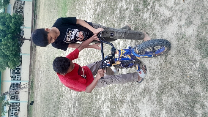 - "The image depicts two young males interacting with a small bicycle outdoors in Lhokseumawe, Indonesia" by FM-hcL462, licensed under CC BY 4.0