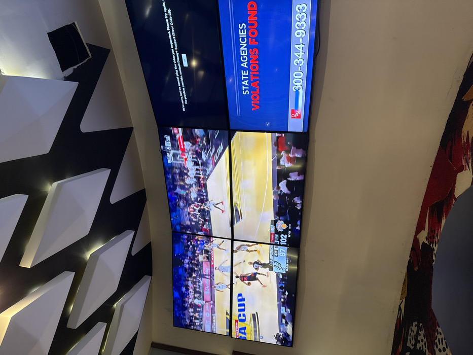Four screens mounted together show various content. One displays an error message stating the video cannot be played due to error code 28, suggesting contacting Disney support. Another screen shows a "State Agencies Violations Found" message with the phone number 300-344-9333. The lower screens display a basketball game in progress, showing a score of 97 to 102 in the 4th quarter. "NBA Cup" is prominently displayed on the screen.