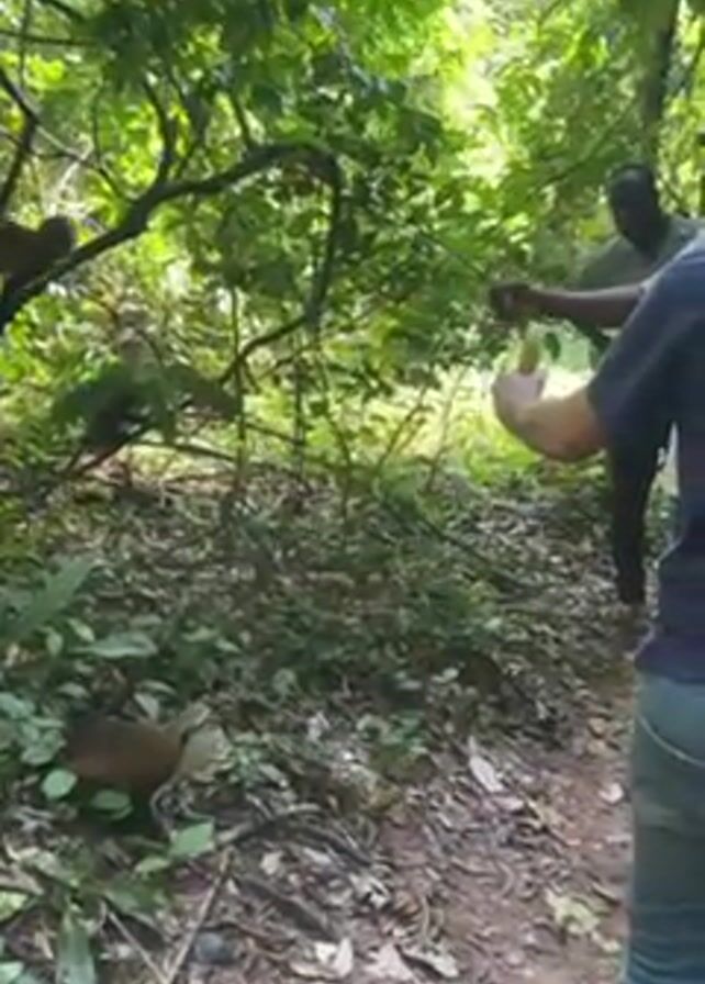 In a lush forest setting, three individuals are interacting with monkeys. One person, dressed in a blue shirt and jeans, holds out a banana. Another individual, wearing a dark shirt and pants, stands behind them and also appears to be engaging with the monkeys. Two monkeys are visible - one sitting on a branch and another on the ground. The monkey on the ground approaches, snatches the banana, and leaps away. The scene is filled with dense foliage and the ground is covered with leaves and twigs. A narrow dirt path runs through the forest. The camera appears to be held by someone observing the interaction.