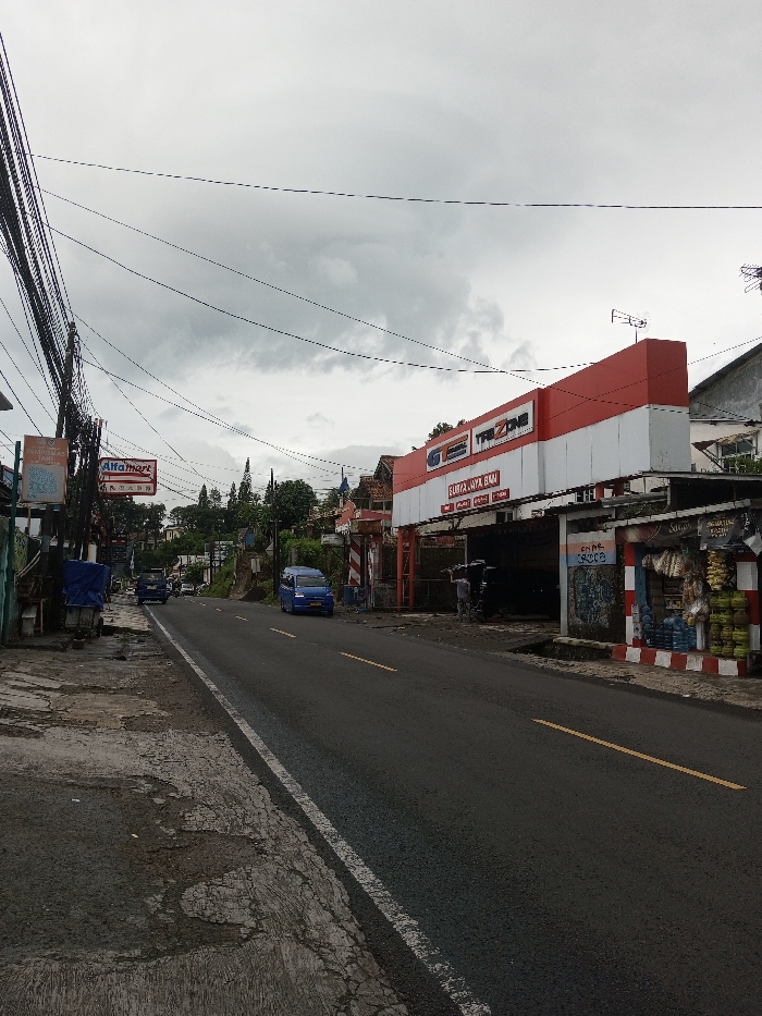 A street scene under a cloudy sky features an "Alfamart" convenience store and a "Tri Zone" retail establishment with a red and white facade. Power lines crisscross overhead. A blue van drives on the road, which has yellow lane markers. The sidewalk on the left is cracked and uneven. A small stall with red and white striped posts stands on the right, next to the Tri Zone building. Vegetation can be seen further up the road.