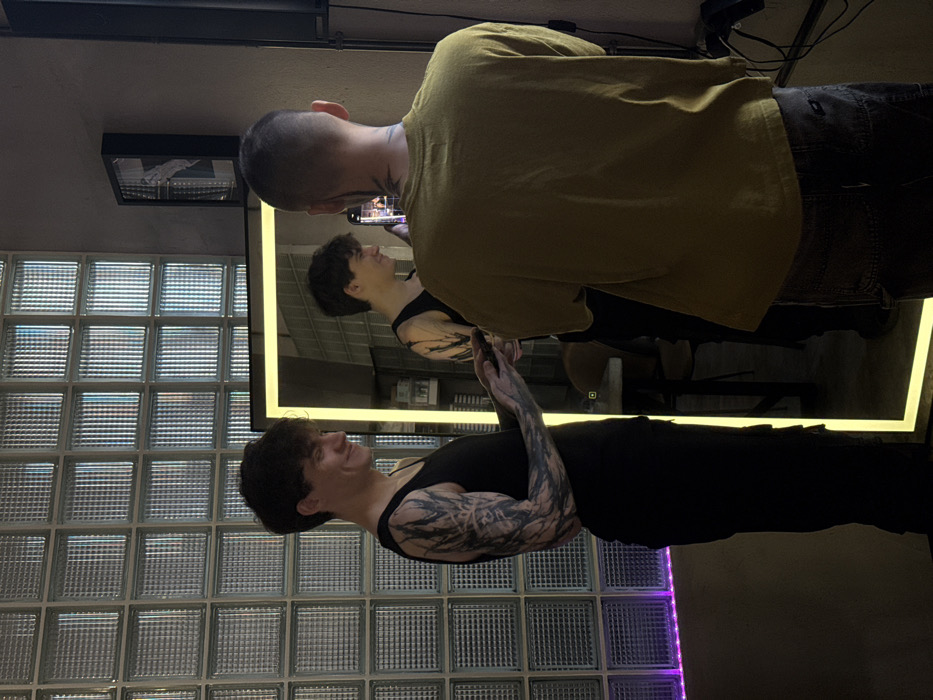 The image depicts two males inside a modern commercial establishment. The exact location in Moscow, Russia, is not discernible from the visual information provided. On the left, a male with dark, short hair and extensive dark tattoos on both arms, resembling organic or tree-branch patterns, stands facing right in a black tank top and dark pants. He is smiling and looking down at a smartphone held in both hands. He is positioned in front of a large, rectangular mirror with an illuminated yellow frame. On the right, partially seen from behind, a male with short-cropped hair and visible neck tattoos stands holding a smartphone, seemingly recording or photographing the first male's reflection in the mirror. He is wearing a loose olive green t-shirt and dark pants. The background on the left features a wall constructed from transparent glass blocks. A strip of purple LED lighting is visible along the base of this wall. The background on the right is a dark, plain wall with a framed picture or artwork and a black speaker on a stand. The mirror's reflection shows parts of the room behind the first male, including what appears to be a table, chairs, and shelving with various items, possibly indicative of a salon, barber shop, or cafe. The overall environment suggests a contemporary interior with an industrial aesthetic.
