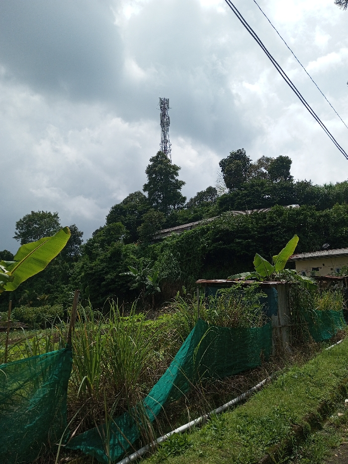 The scene depicts a verdant, hilly landscape in Vieng Phouka, Laos, under an overcast sky with heavy grey clouds. In the background, a tall, grey cellular tower stands prominently at the apex of a densely forested hill, rising above the tree canopy. Below the tower, nestled within the thick foliage on the hillside, are several residential or utility buildings with light-colored walls and dark roofs. In the midground, the hillside slopes downwards, covered in a mix of natural vegetation and what appears to be cultivated areas. A large, bright green banana leaf is visible on the left, partially obscuring other greenery. Further right, a small structure with a corrugated metal roof and exposed wooden supports is partially visible, flanked by tall grasses and smaller plants. Green mesh netting is draped around this area, suggesting a boundary or protective barrier for cultivation. The foreground consists of overgrown grass and various plants. A segment of white PVC piping runs horizontally near the bottom right, resting on the ground. No people are visible, and no discernible actions or interactions are taking place. The overall environment is one of rural or semi-urban development amidst lush tropical greenery.
