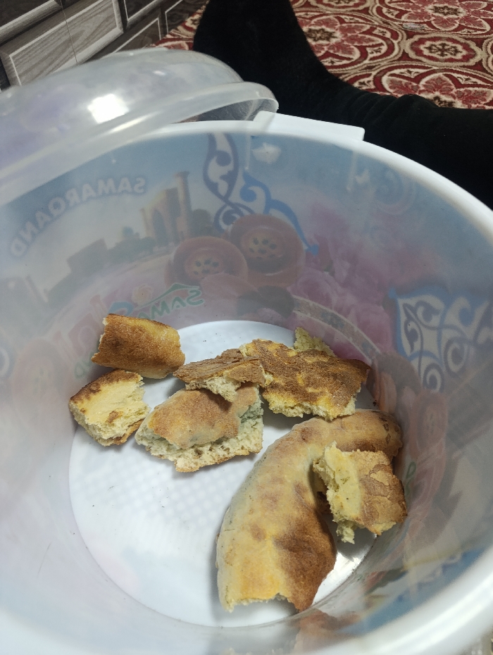 A plastic container with a loose lid contains remnants of bread. The bread pieces vary in size and shape, some with a golden-brown crust. Mold is present on a few of the bread pieces, suggesting spoilage. The container features a printed design in blue and brown. Part of a leg wearing a black sock is visible in the background. A patterned carpet is underneath the leg.