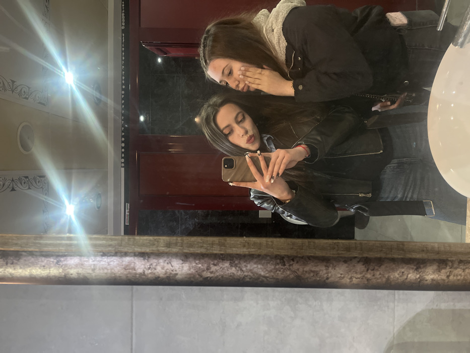 The image displays a mirror selfie captured within a public restroom located in Gabrovo, Bulgaria. Two young females are visible from the waist up, reflected in a large mirror. The female on the left, holding a light-colored smartphone with her right hand, is actively taking the photograph. She has long, dark hair, wears a black leather jacket over a blue collared shirt, and blue jeans. Her lips are pursed in a "kissing" pose, and her fingernails are painted with a black and white design. A thin red bracelet is visible on her left wrist. The female on the right stands beside her, with dark hair parted to one side, wearing a dark puffer jacket with a light, possibly faux fur, collar or hood. She is pressing both hands against her cheeks, pushing them upwards, creating a playful expression with pursed lips. The background, visible through the mirror's reflection, consists primarily of two dark red/maroon doors, likely indicating restroom stalls. Dark, reflective tiled walls are visible between and around the doors. The ceiling is white with decorative black scrollwork patterns and features two bright recessed light fixtures, which produce prominent lens flares in the reflection. In the immediate foreground, the top rim of a white ceramic sink basin and a portion of a chrome faucet are discernible. A textured, multi-toned vertical frame borders the left side of the mirror, adjacent to a light grey tiled wall.
