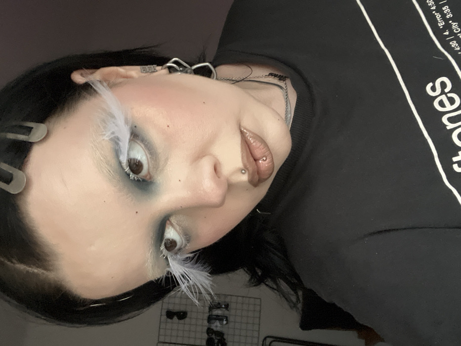 A close-up, frontal-side portrait of a person in the City of Zagreb, Croatia, depicts an individual with dark hair styled with a center part and two silver-toned hair clips. The subject's eyes feature white feathered false eyelashes and teal eyeshadow; their gaze is directed towards the upper right. Light-colored eyebrows are present. The lips are adorned with glossy medium-brown lipstick or gloss, and feature a labret piercing below the lower lip and a possible vertical labret piercing on the lower lip. The individual wears a black crew-neck shirt with white text, partially legible as "ftones" and "4:30 | 4. 'Error' 4:50 |". A silver-toned geometric hoop earring is visible on the right ear, along with a thin dark necklace and a silver-toned chain. The background consists of a light-colored wall section and a black grid panel with indistinct dark objects. The scene is illuminated by soft, front-facing light.